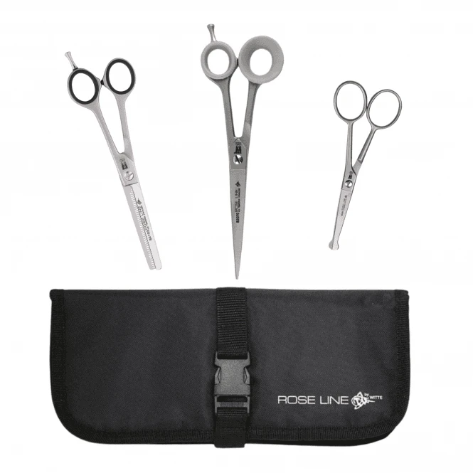 The Roseline 3 Piece Scissor Set comprises of 3 professional dog grooming scissors suitable for everyday use. Made from ice tempered stainless steel for durability. Set comes complete with black wrap case.