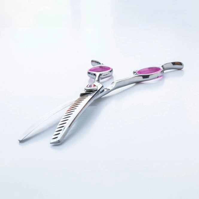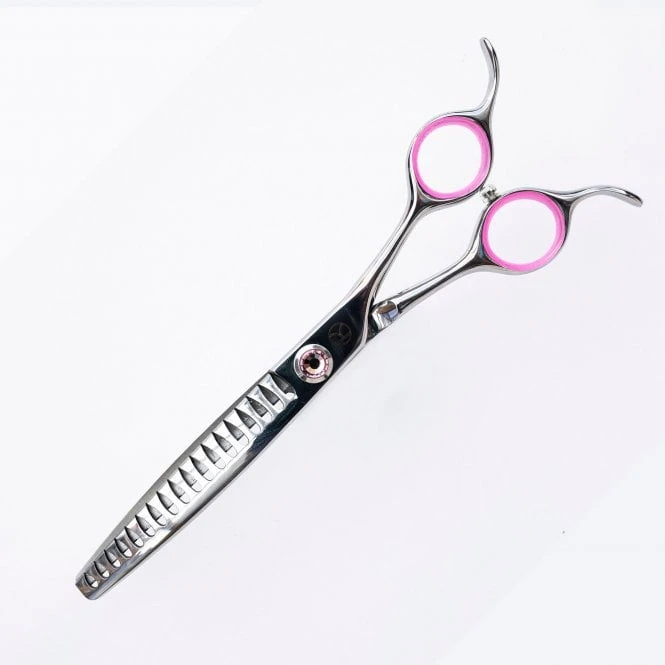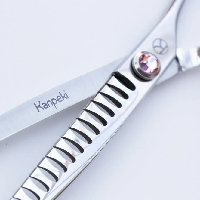 The Kanpeki Curved Pink 6.5″ 18T Chunker Scissor is a fine quality dog grooming scissor manufactured from tough pure Japanese stainless steel giving maximum blade life and tooth strength for a consistent professional finish.