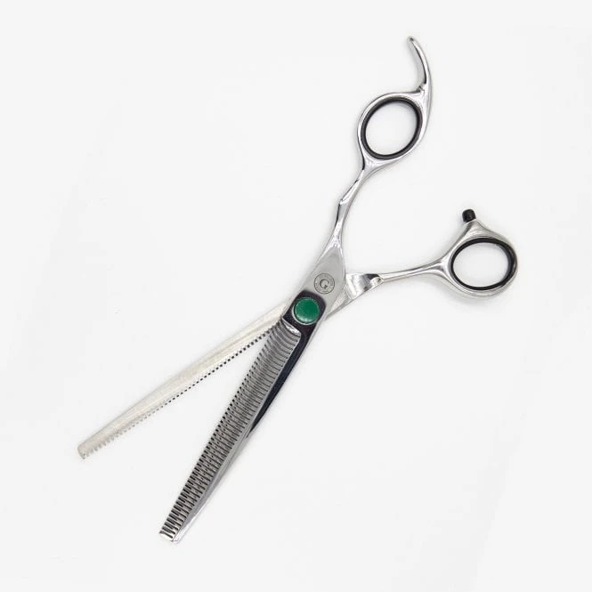 Made from recycled stainless steel, which is wear and abrasion resistant. The Groomers Simply G thinning scissor has a flat green ball bearing screw for adjustable tension. Tension key included.