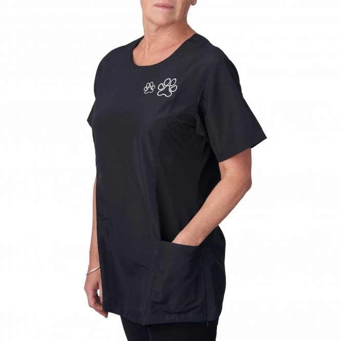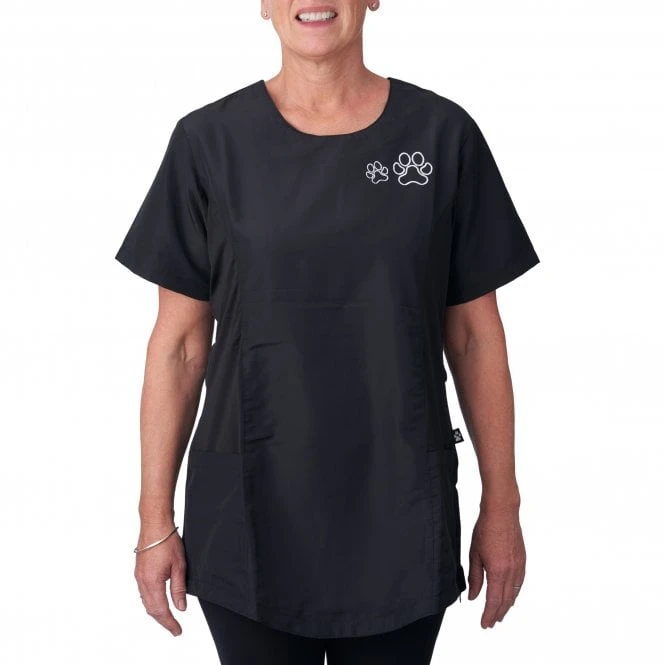Lightweight & comfortable with smart design details including elasticated side panels and a bottom split zip for added flexibility and movement. Featuring a round neckline and finished with a double paw print design on the chest for a touch of charm; our A-Line Grooming Top is made from quick-drying, hair resistant polyester, perfect for the demands of a busy grooming environment.