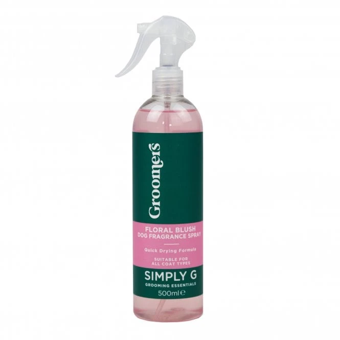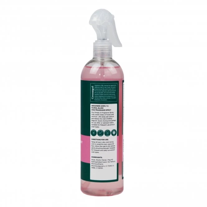 Groomers Simply G Floral Blush Fragrance Spray for dogs has been formulated to lift away unpleasant odours and gorgeously refresh the coat in one quick spritz. With our Floral Blush fragrance of sweet florals and red fruit, this spray leaves the coat with a long lasting scent. A pH balanced formula that is quick drying and perfect for use after or between baths. Suitable for frequent use and all coat types.