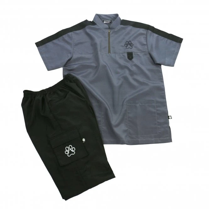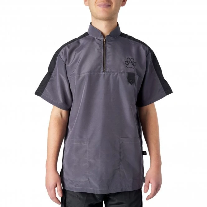 Groomers Mens Lucio Grooming Jacket in modern stylish grey with black accents, is a practical dog grooming shirt with stand-up mandarin style collar and small front zip opening. It has short sleeves with two front pockets perfect for storing equipment whilst grooming.Â
