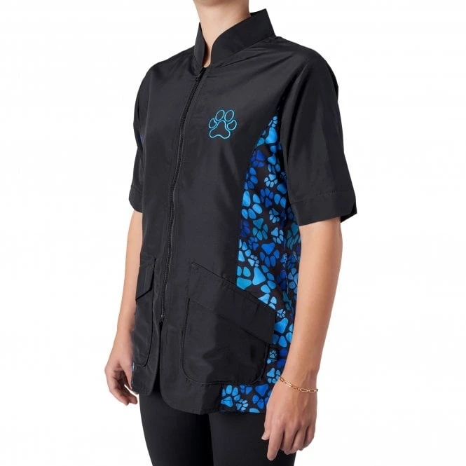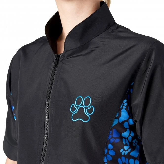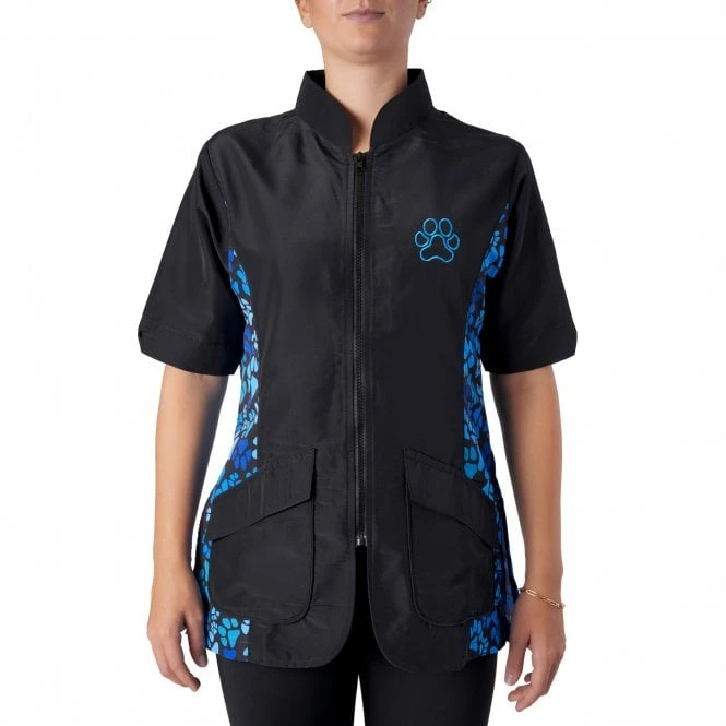 The Black Mandarin Collar Tunic is both practical and wearable with flattering fitted design. This stylish short-sleeved black tunic features a blue paw print design on the sides and a paw print motif on the chest.