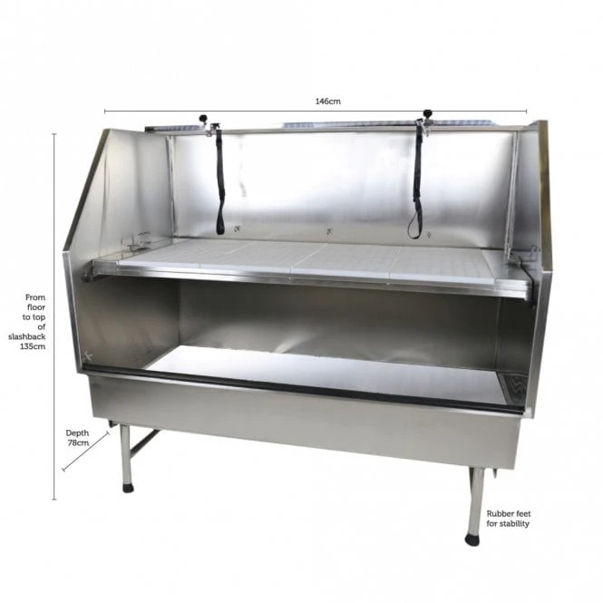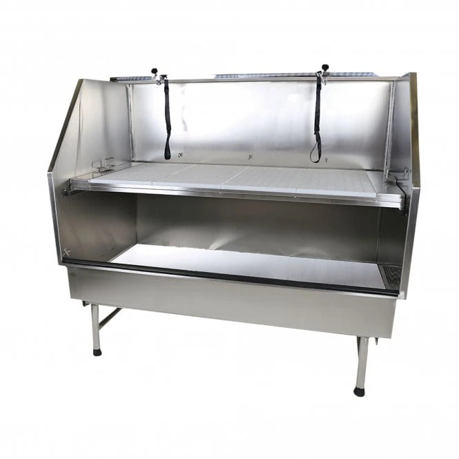 Suitable for large dogs weighing up to 150kg, this bath features a rolled front edge for stability and groomer comfort and is manufactured from thick 1.5mm heavy gauge stainless steel. It also features a removable platform made from durable steel, with a plastic grid that allows for medium and small dogs to be washed at a height suitable for you. The open front of this innovative bath allows large and giant breeds to step directly into the tub and offers ample room for bathing. The bath is highly durable and easy to clean and comes equipped with a built-in H-bar and two grooming nooses. The bath also has a high back and sides to protect against splashes.