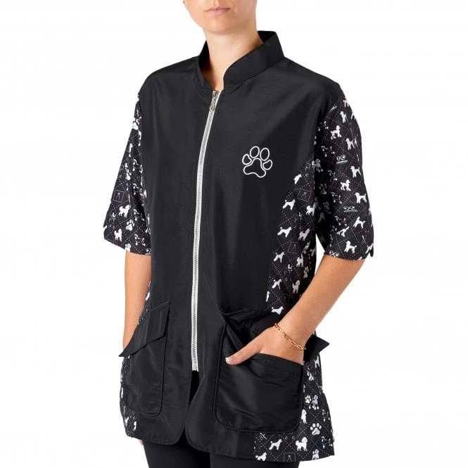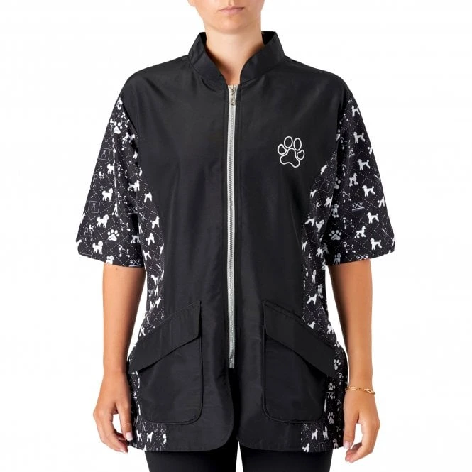 The Penny Poodle Mandarin Collar Tunic is both practical and wearable, and was designed with you in mind. This stylish short-sleeved black tunic features a white poodle design on the sides and sleeves, paw print motif on the chest and a contrasting silver zip.