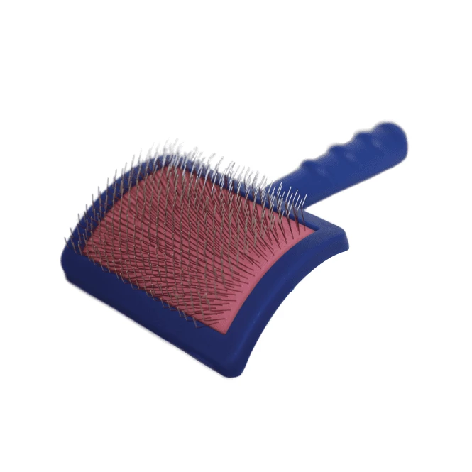 Detangle and remove loose undercoat quickly and effectively with this large-sized professional dog slicker brush, which has been designed for detangling work on long, thick or curly coats. The larger size means it is especially suited for large or giant breeds to cover the coat area faster. The brush features an ergonomically designed handle and is very lightweight, thus ensuring that there is minimal stress on the hand and wrist while grooming. The Show Tech slicker brush is perfect after bathing when you are drying the coat.
